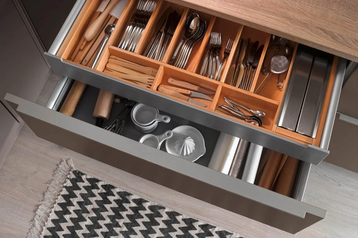 Use pull-out organizers and carousels in cabinets. They transform chaotic shelves into organized sections. They are especially useful for corner units, where half the items tend to get lost.